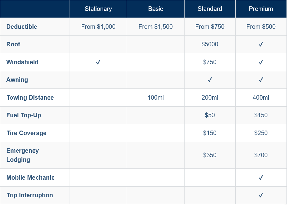 - Premium and Standard: Lo’s RVRental covers costs beyond your deductible.