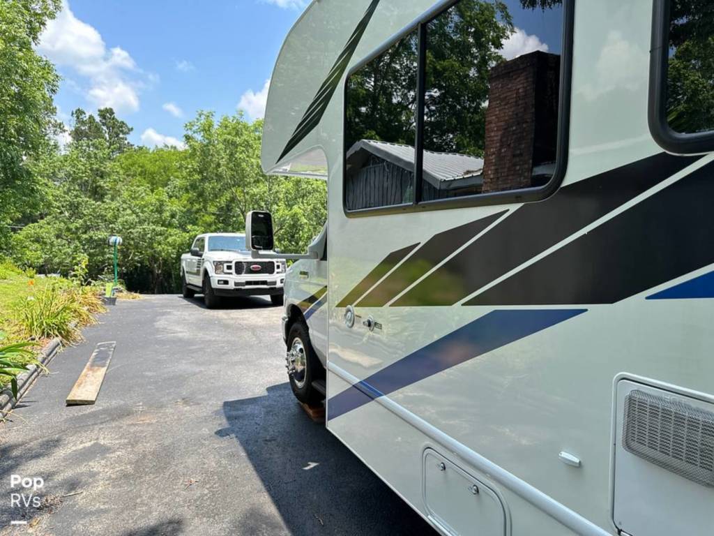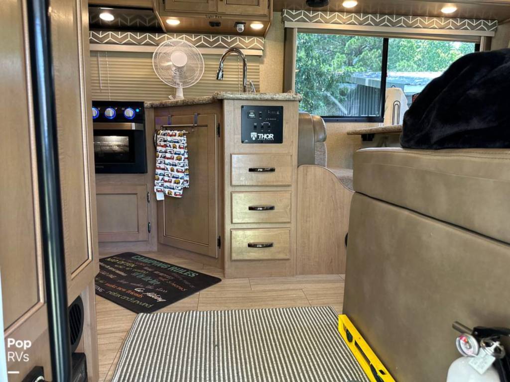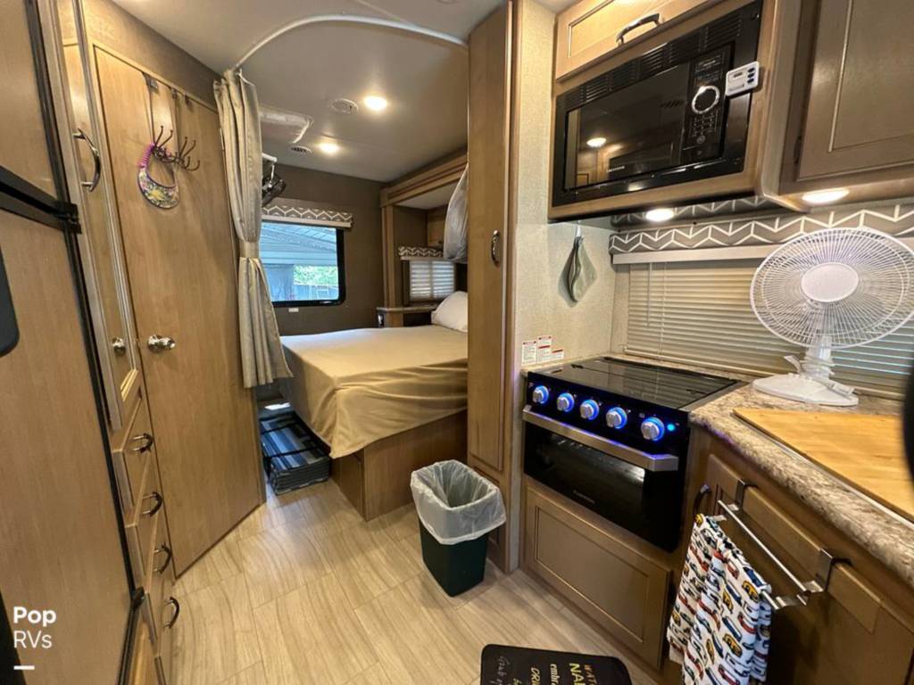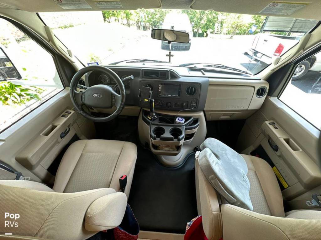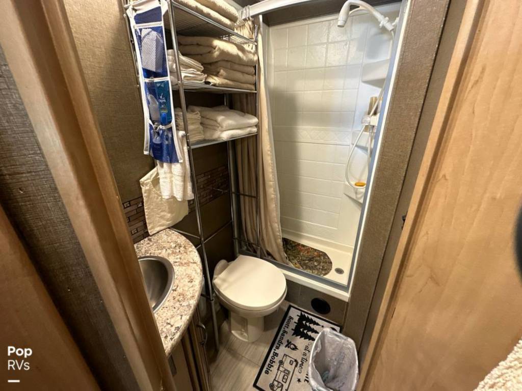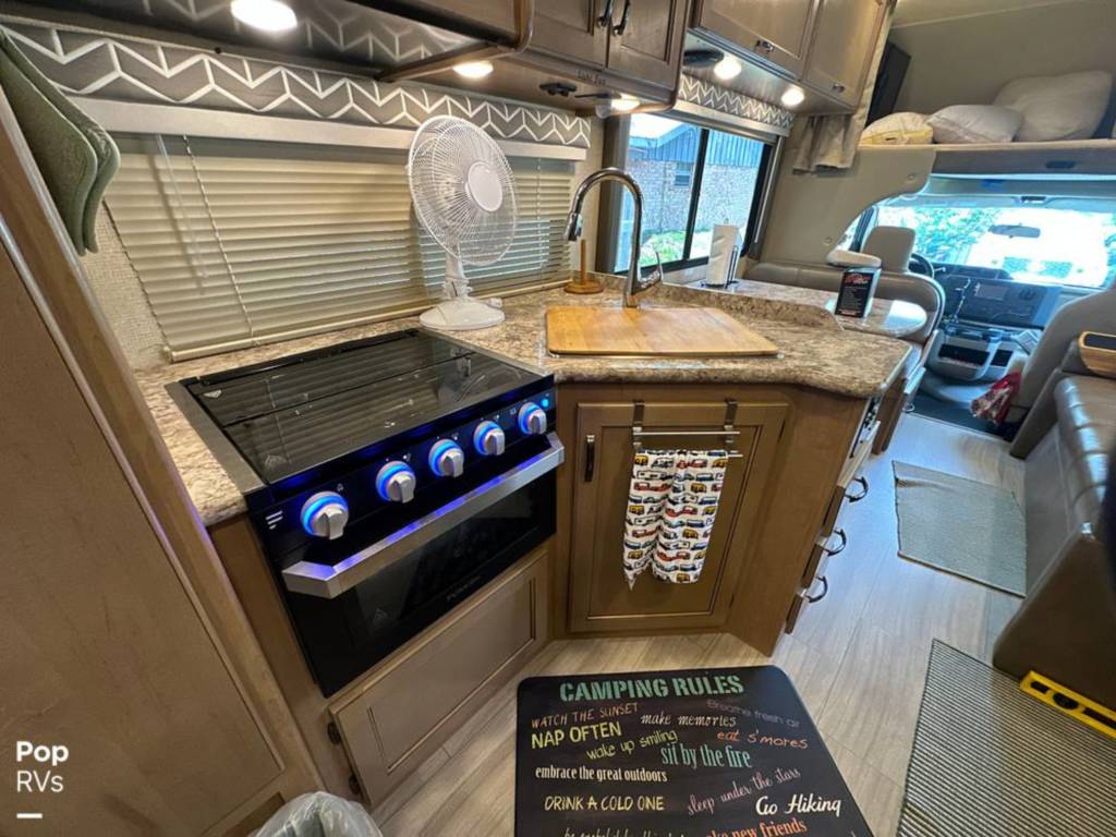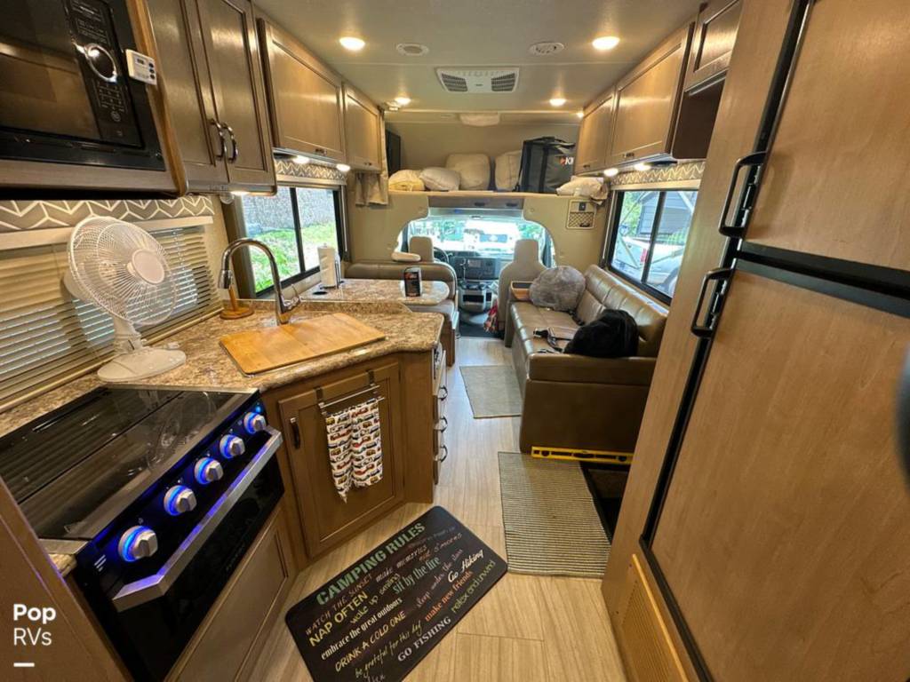 Cabinets, Cooktop Cover, Double Kitchen Sink, Hood Fan, Microwave, Oven, Pantry, Refrigerator/freezer, Stove, Bluetooth/aux., Entertainment Center, Interior Lighting, Stereo System, TV, Air Conditioning, Bathroom Sink, Bed – Cabover, Bed – Full/queen, Ceiling Vents, Control Center, Dinette Sleeper, Heat, Medicine Cabinet, Shower, Sink, Skylight, Slide-out, Sofa Sleeper, Storage, Toilet, USB Charging Port, Water Heater, Windows – Blinds, 110 Lighting, 110 Outlets, AC Electrical Power, Backup Monitor, Batteries – Engine (1), Batteries – House (1), City Water Hook Up, Generator, GFI Circuit Breakers, Hitch, Power Cord, Powered Side Mirrors, Alloy Wheels, Awning, Entry Assist Grab Handle, Exterior 110 Outlet, Exterior Storage, Propane Tanks, Roof Access Ladder, Back Up Camera, Co2 Detector, LPG Leak Detector, Spare Tire Kit, Ford Chassis, Fiberglass Construction, Automatic Transmission, 1-Axle, Waste capacity: 29 gals, Gray water capacity: 25 gals, Width: 8′ 2″, Height: 11′