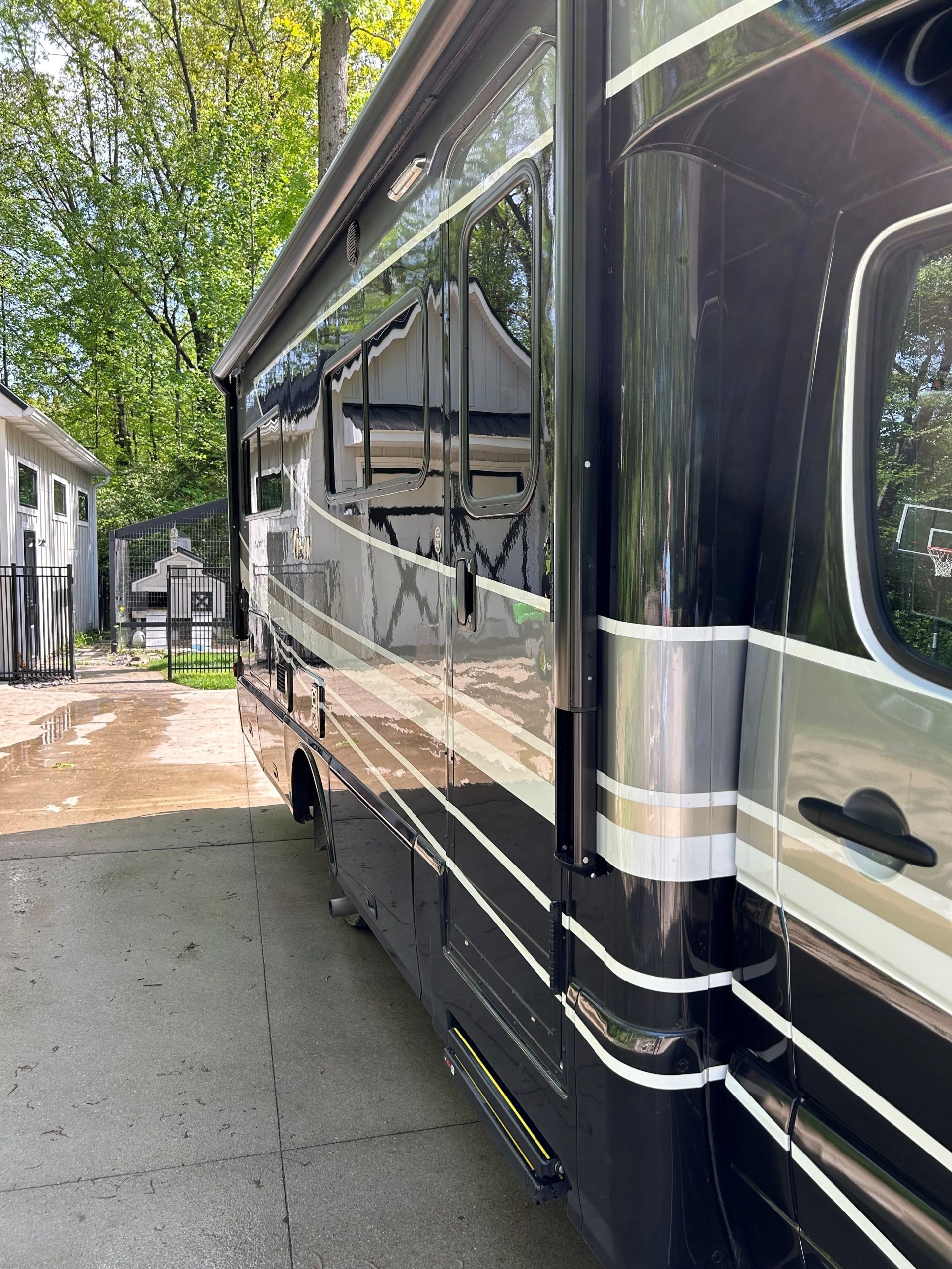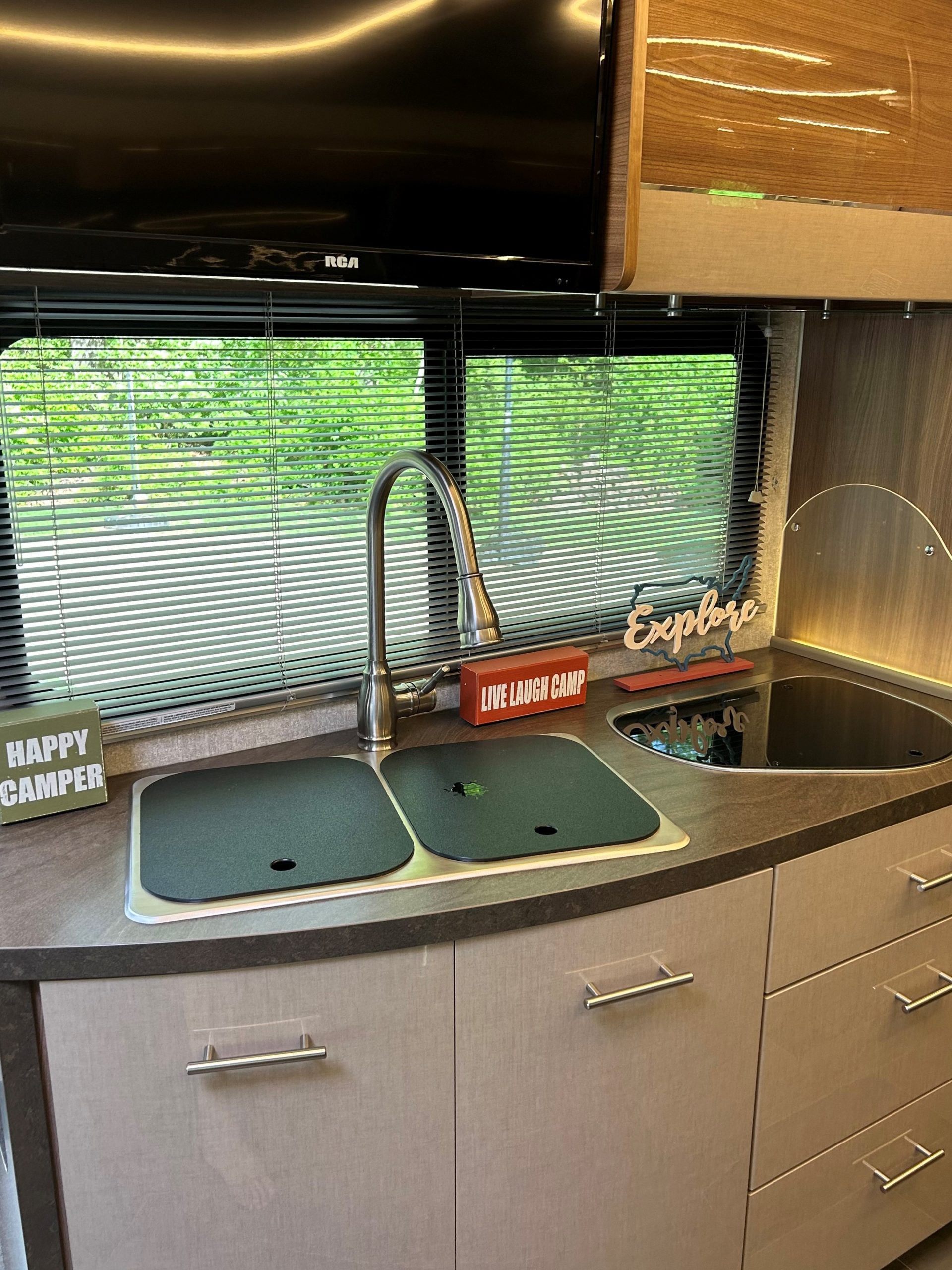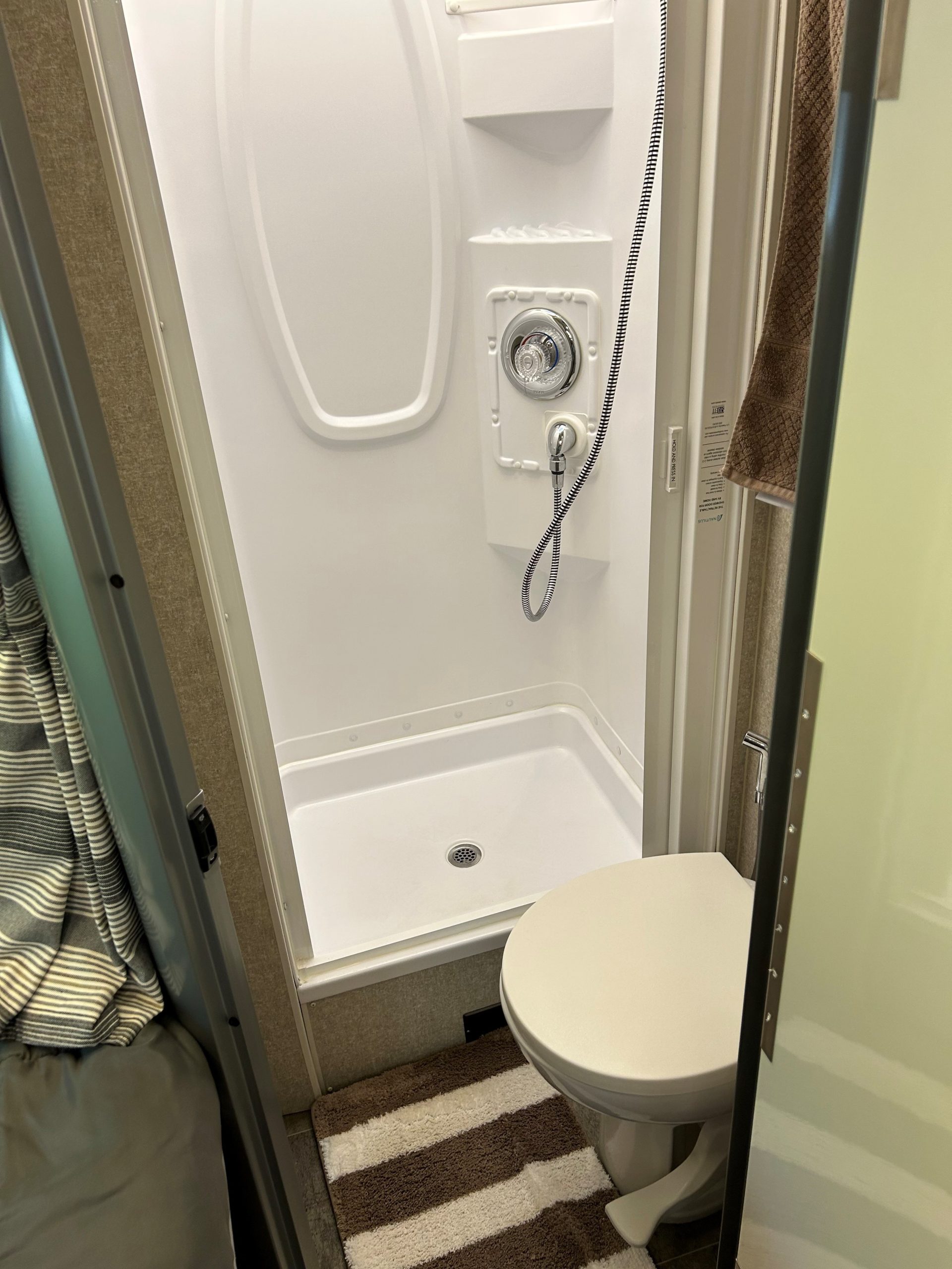 Cabinets, Cooktop Cover, Counter Backsplash, Counter- Material (Laminate), Dinette (U-shaped W/footrest), Hood Fan, Kitchen Sink, Microwave/convection Oven, Pantry, Refrigerator/freezer, Stove, Bluetooth/aux., CD Player, DVD Player, Entertainment Center, Exterior TV Source, Interior Lighting, Power Charging Center, Stereo System, TV, Air Conditioning, Bathroom Sink, Bed – Cabover, Bed – Full/queen, Black Water Flush System, Ceiling Vents, Central Heat, Control Center, Flooring (Vinyl), Heat, Interior Sun Screens, Keyless Entry, Leat