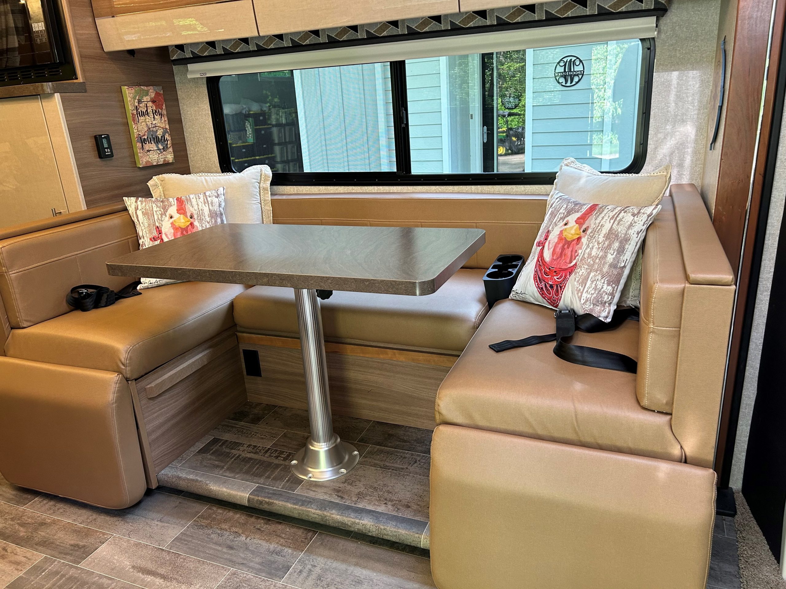 There are expansive windows for viewing, especially on the patio side, with 3 MCD solar/blackout roller shades up front. An oversized U-shaped dinette/lounge area includes lift-up ottomans, converting your dinette bench to two separate lounge areas towards your patio and TV over the sink.