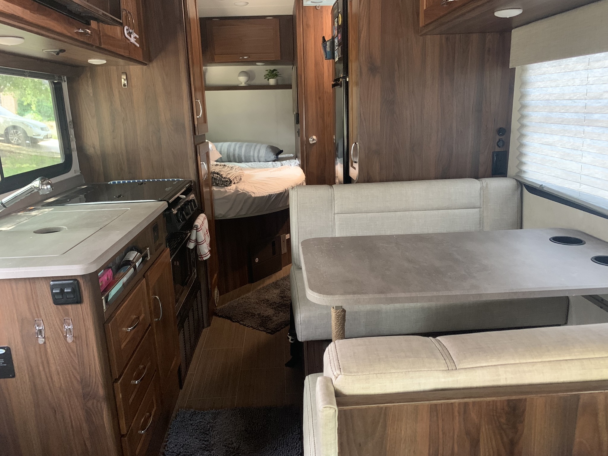 Step inside this spacious Winnebago Vita 24F and find a motorhome that will take you on a trip of a lifetime!  It features a rear bath for added privacy, and a comfortable 50″ x 80″ bed for you to enjoy a good night’s rest.  There is also an overhead bed above the cockpit to give you another sleeping spot, while still saving space throughout the unit.  You will have plenty of space to store all of your items between the multiple multi-use storage cabinets as well.  Your meal times can be family time when you enjoy them at the booth dinette, and you can even transform it into an extra sleeping space too!