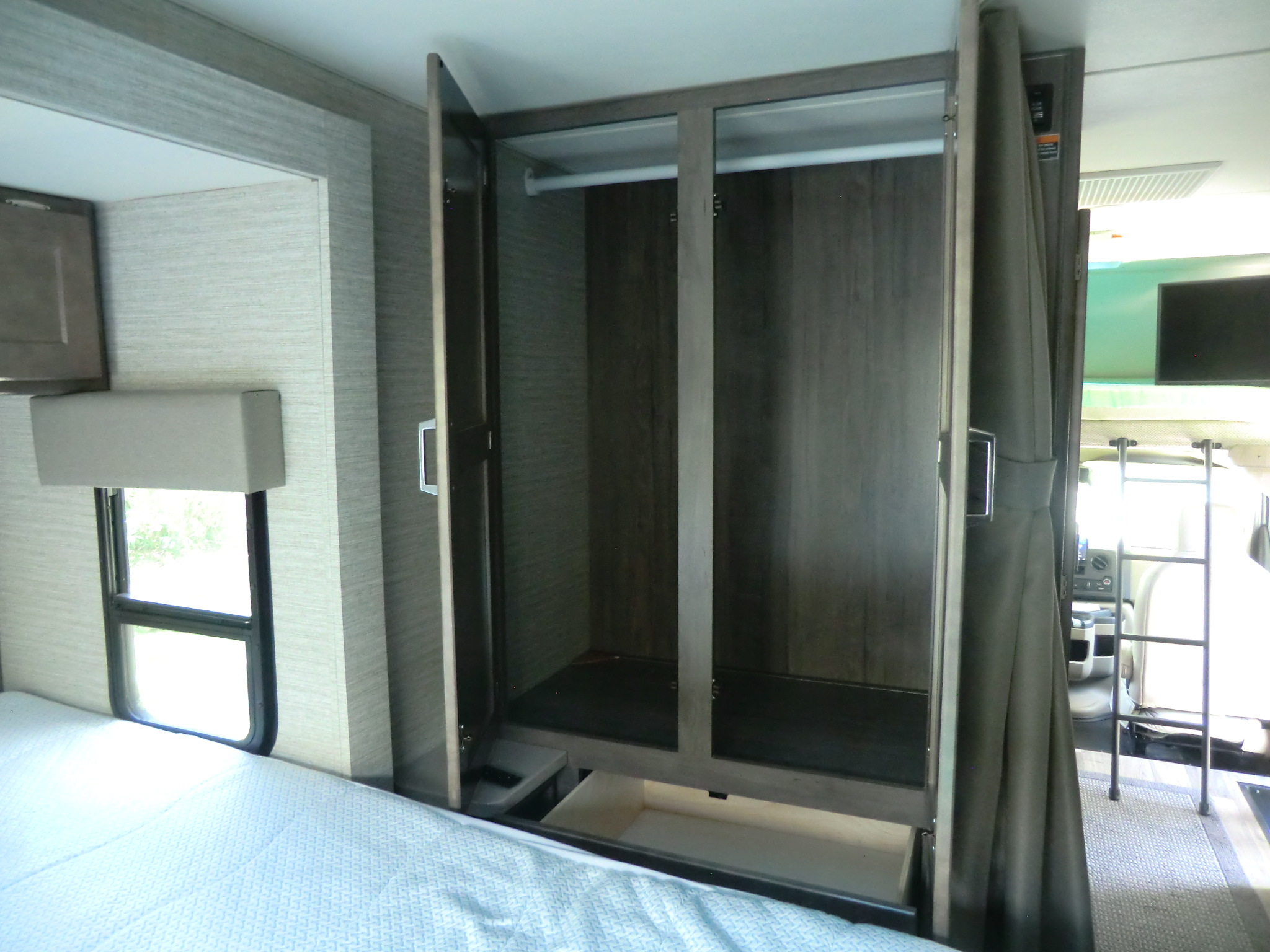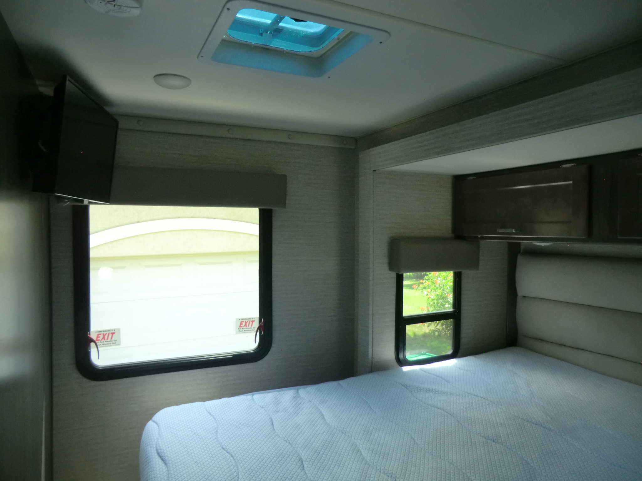 This coach makes a great RV for a couple or a family of five when you utilize the U-shaped dinette as a sleeping area after dinner and games are over for the evening. The kids will surely love the overhead cab bed while you retreat to the rear corner bedroom with a queen bed slide, a nightstand and a wardrobe. You might even like to invite one more guest to sleep over since this coach can sleep six. You can watch the 24″ HDTV while the kids watch a movie on the 32″ HDTV with DVD player. And the galley kitchen and full bathroom allow you to travel without needing to go into town. This model comes standard with a Ford E350 chassis, yet you might like to choose the E450 chassis option which would increase some of the specifications for this model.
