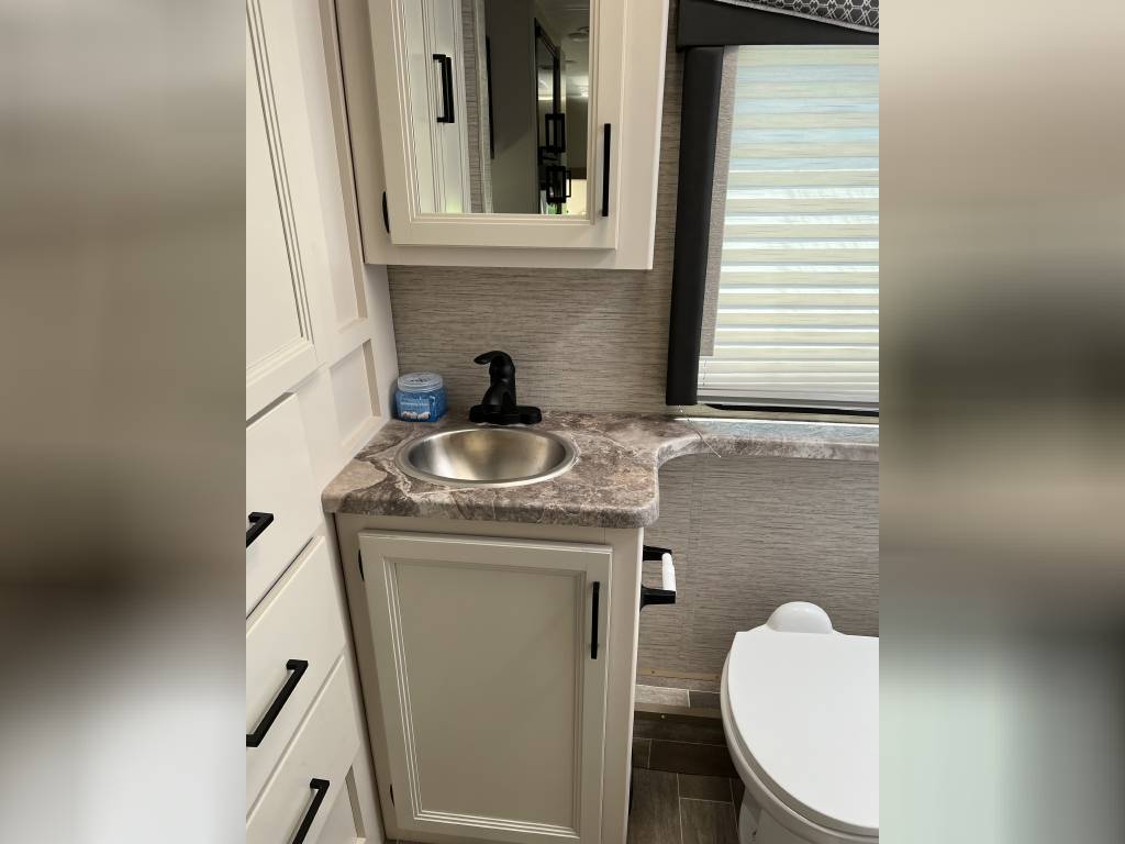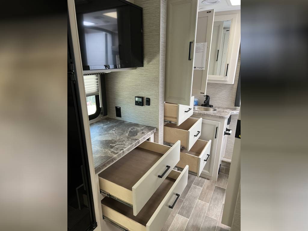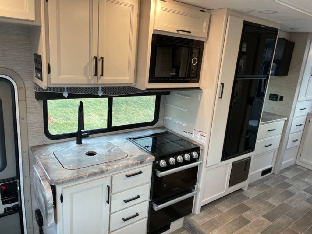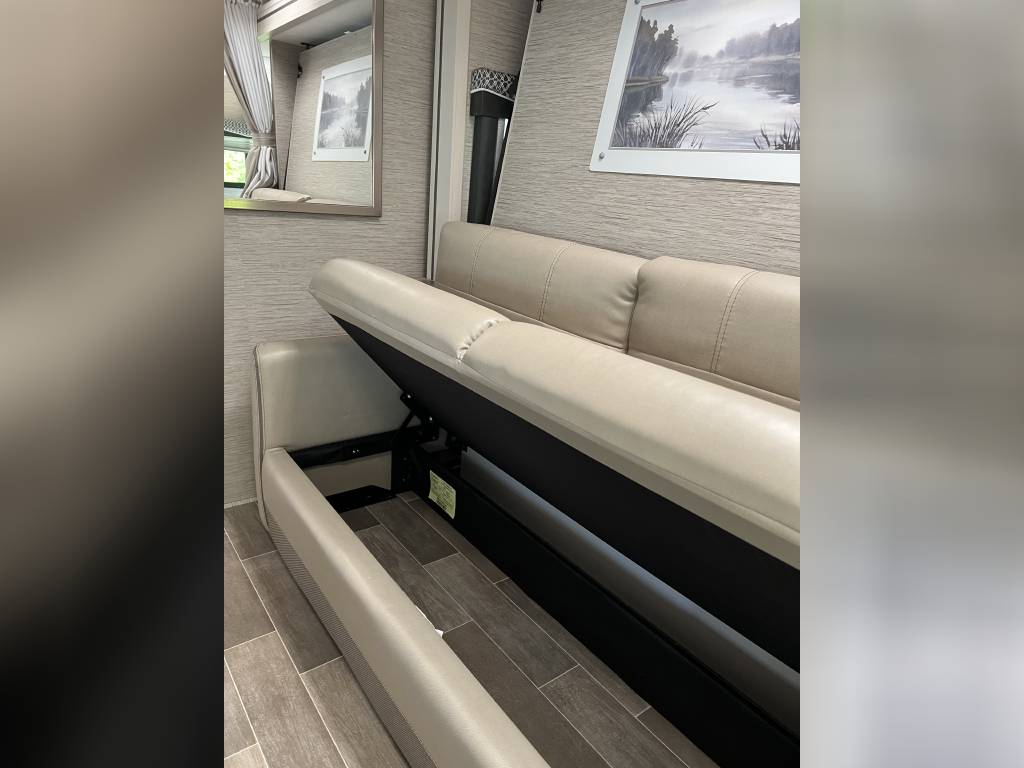 There are THREE televisions for entertainment- 2 inside the coach and a BONUS outside TV! Engage the power awning and swing out the television at night for a true movie outside under the stars experience. Inside, there is a 39″ swivel TV for the guest on the cab-over bunk or turn it towards the sofa and dinette area. There is also a 32″ TV directly in front of the sofa/Murphy bed! The kids can take their X-Box/Playstations/Nintendo switch and connect to the TV’s for gaming on the go! The entertainment hub allows individual programming on each TV or set it to broadcast the same program on all 3 TV’s.