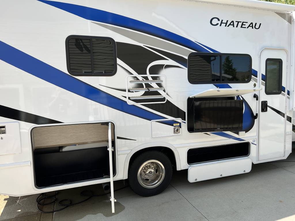 This unit comes with all the standard features of the Chateau 25M plus the following added options: Ivory Coast cabinetry, heated exterior mirrors, leatherette driver/passenger chairs, convenience package, cabover child safety net, 3 burner gas cooktop/oven, exterior entertainment center, 100W solar charging system, high output roof A/C, holding tanks with heat pads, and outside shower.