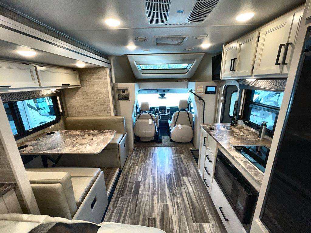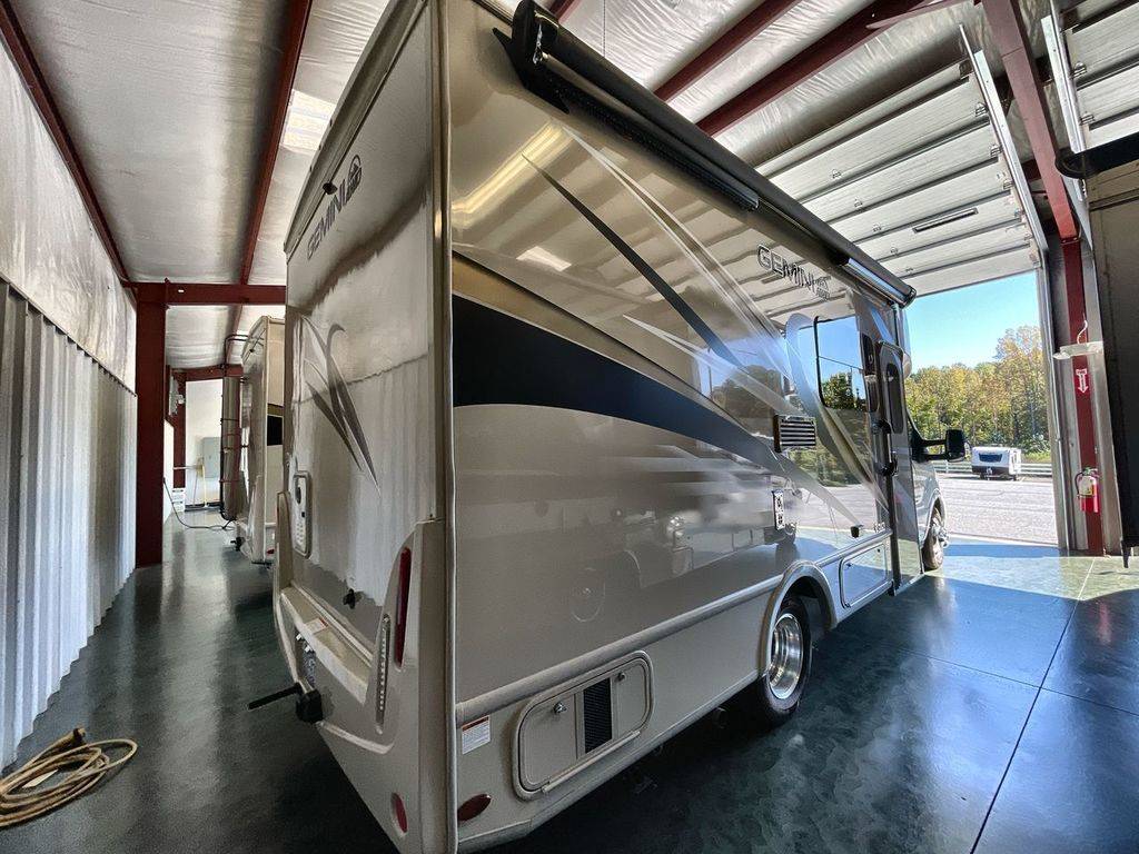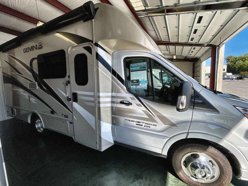 Get ready to set out to new destinations in a Gemini AWD Class B+ gas motorhome by Thor Motor Coach. Along the exterior portion you will find a premium one-piece TPO roof and a one-piece fiberglass front cap with integrated wing walls. Your extra camping gear can be stored in the Rotocast storage compartments with lights, and there is a power patio awning with integrated LED lights which will allow you to sit outside just a bit longer each night. The interior décor of the Gemini has a modern and classy look with its residential vinyl flooring, Euro-style cabinet doors, and pressed laminate countertops, plus the Winegard ConnecT 2.0 WiFi/4G/TV antenna will keep you connected!