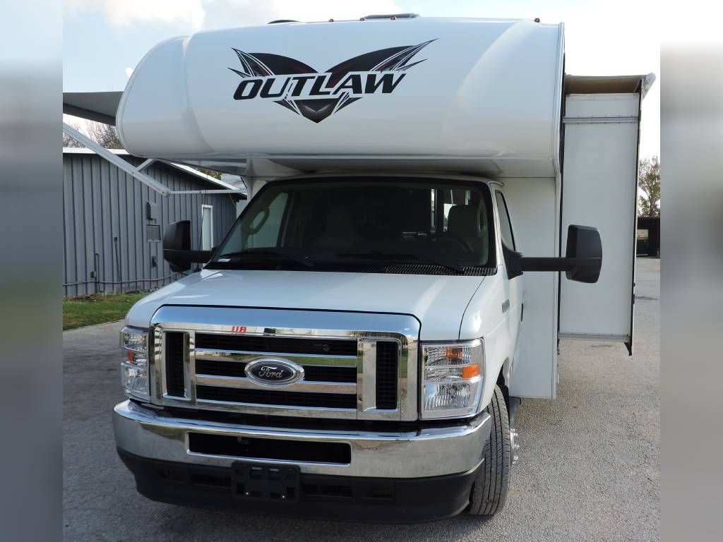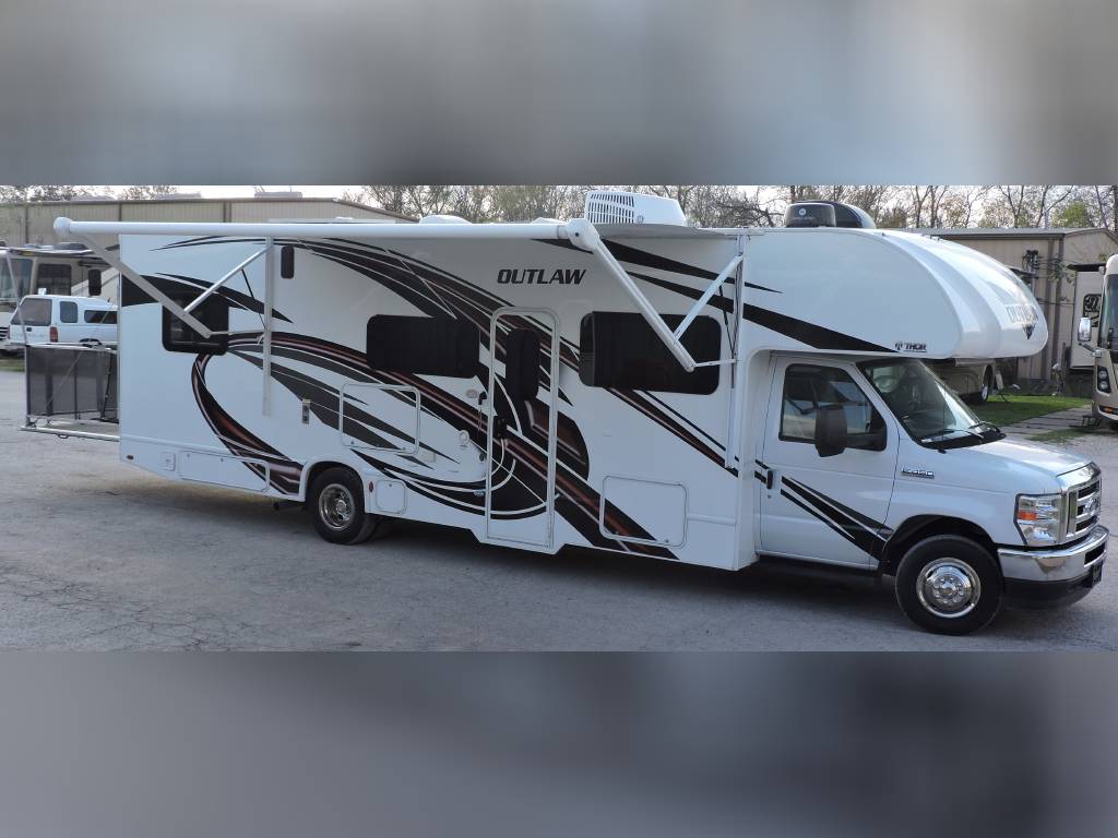 2022 Thor Outlaw, Class C, Toy Hauler, GAS, 1 SLIDES, FORD V-8, Ford Chassis, Model – 29J,King bed drop down in garage, 30 AMP., 31 FT., 4935 MILES, Tire Size: 225 75 16 TIRES