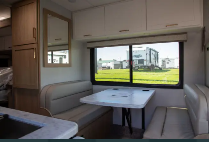Step inside and you’re welcomed by a warm, bright interior filled with smart design touches and cozy details. The space is open and inviting, with plush seating, soft lighting, and beautiful finishes that make it feel more like a boutique hotel than an RV. After a long day of exploring, stretch out on the comfortable queen-size bed, let the kids or guests enjoy the over-cab bunk, and easily convert the dinette into extra sleeping space when needed.